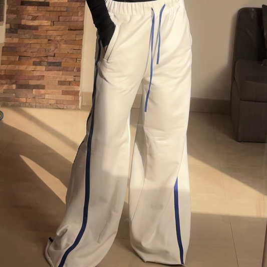 Summer sporty white wide leg pants with blue stripes