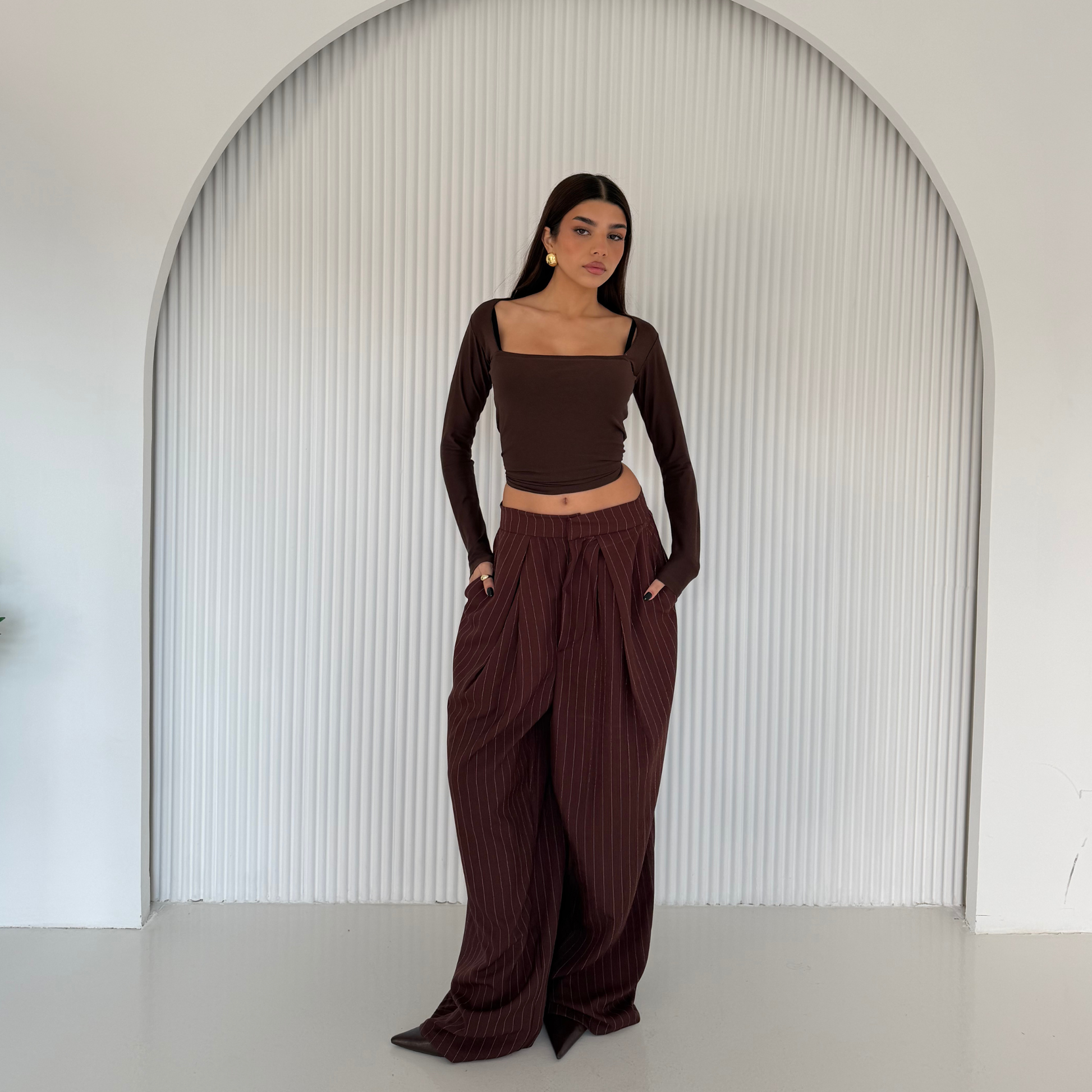 Brown Pinstripe Wide-Leg Tailored Pants